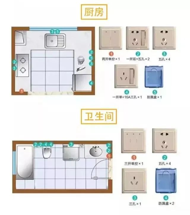 • 卫生间空气潮湿,经常用水,插座要带防溅盒。