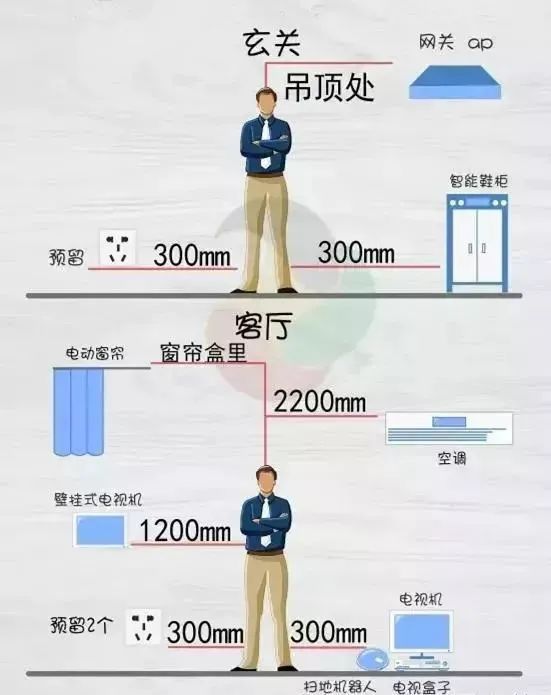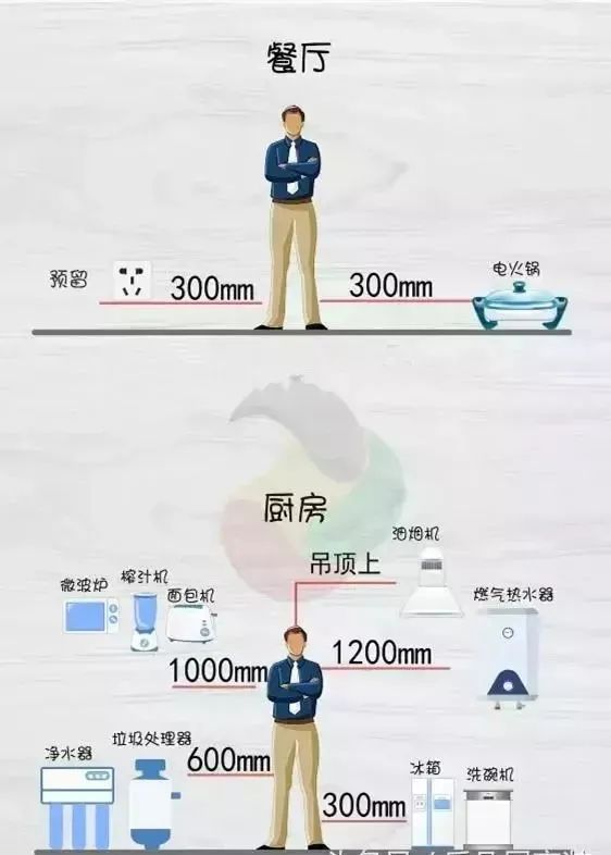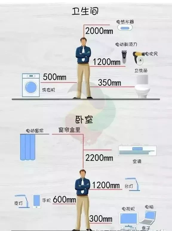 如果你觉得上面的表格比较抽象的话,我们再来看一下插座布置高度图表,这样你该对插座安装位置一目了然了