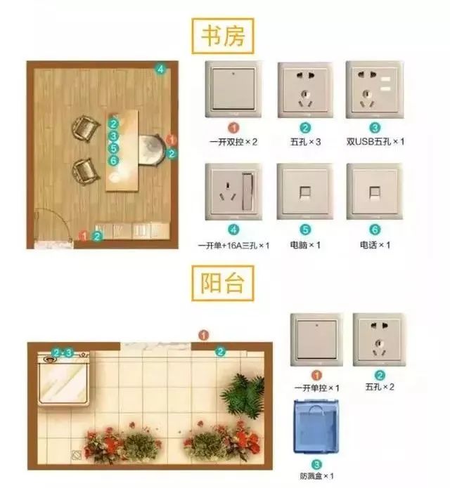 6. 阳台:1个阳台开关、1个阳台插座、1个阳台照明开关、1个阳台照明插座、1个阳台插座(备用)、1个阳台插座(备用)。